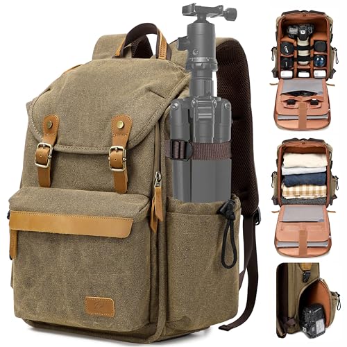 Padwa Lifestyle Khaki Camera Backpack - Canvas Camera Bag with 16” Laptop/Lens & Tripod Compartment, Multipurpose Camera Backpacks for Professional Photographers