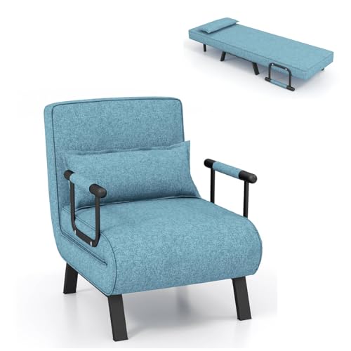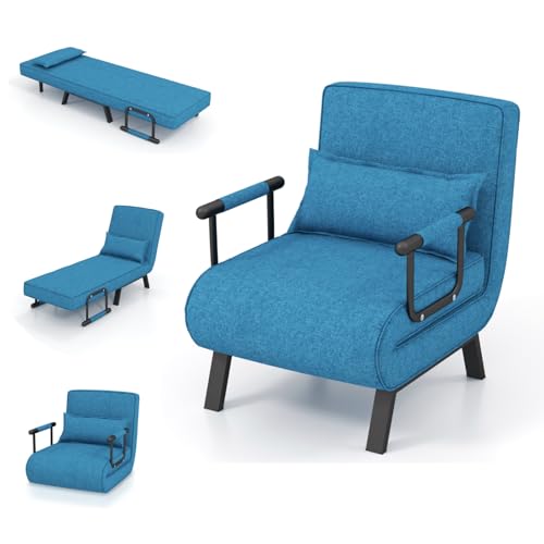 COSTWAY Folding Sofa Bed, 4-in-1 Convertible Single Sofa Chair Bed with 6-Position Adjustable Backrest and Pillow, Padded Seat Lounge Couch Guest Sleeper Recliner Armchair for Living Room (Blue)