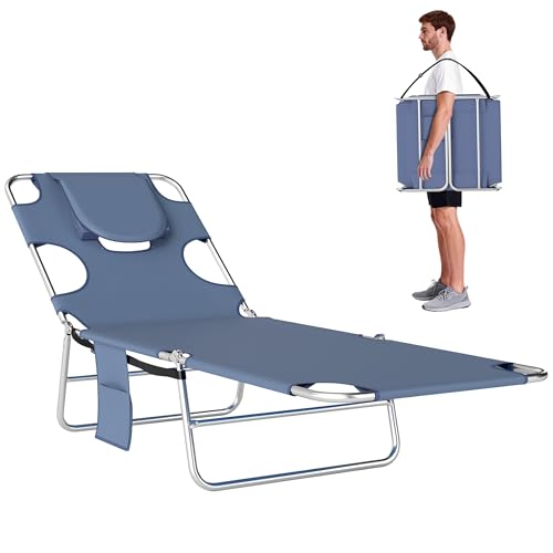 Outsunny Foldable Sun Lounger, Beach Chaise Lounge with Reading Hole, Arm Slots, 5-Position Adjustable Backrest, Side Pocket, Pillow for Garden, Beach, Pool, Blue
