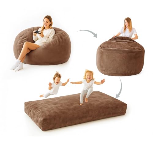 SANAE Convertible Bean Bag Chair and Bed: 4FT Bean Bag Chair Converts to 6FT Bean Bag Bed, Memory Foam Corduroy Brown Floor Lounger with Filling for Adults – Multi-Use for Living Room, Bedroom