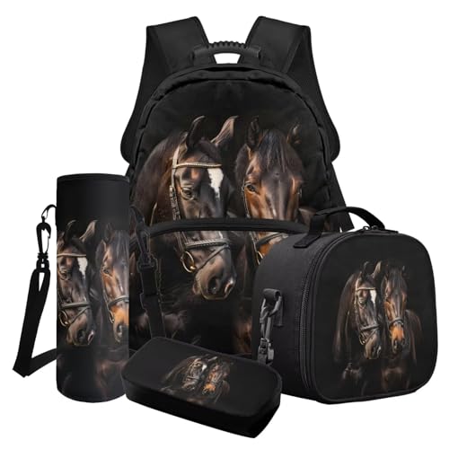 UOIMAG Black Horse Backpack Kids School Bag and Lunch Bag Set 4pcs with Water Bottle Carrier Zipper Pencil Case