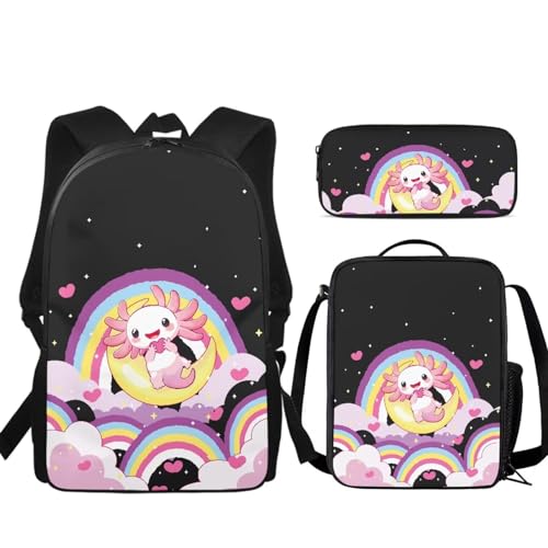 Howilath Axolotl Backpack for Girls 9-10 with Lunch Box Set Kids School Bag and Lunch Bag 3-in-1 School Bags & Lunchbox & Pencil Case for Primary School