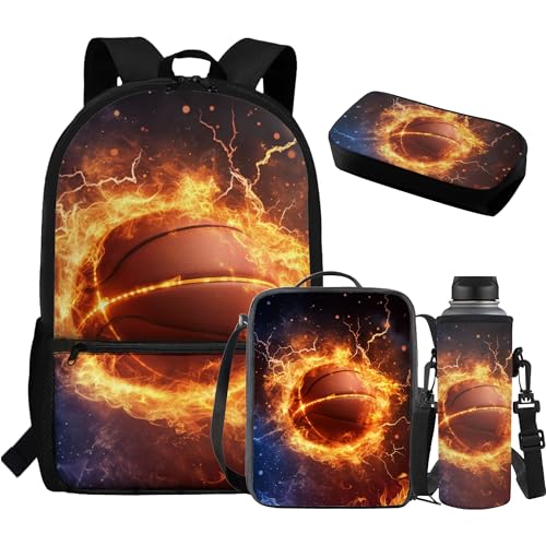 ASQVTIFE Kids Backpack Set Water Fire Basketball School Bag and Lunch Bag Set for Teens Boys 4 in 1 Basketball Children Bookbag for Kindergarten Elementary Large Capacity Travel Daypack