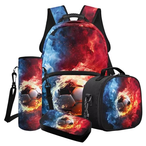 Nittanovaca School Bag Backpack and Lunch Bag Set,Fire Soccer Printed Schoolbag Set of 4,Kids Boys Bookbag Sturdy Backpack for Back to School