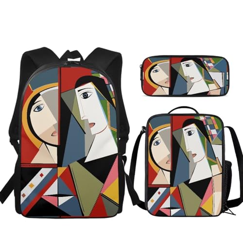 Buxolandt 3Pcs Backpack Sets for Teen,Van Gogh's Abstract Art Cute Colorful Bookbag School Daypacks for Elementary Middle Students Stationery Bag and Lunch Bag for Back-to-School Season