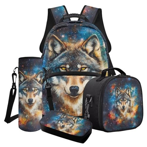 Cxdvotvy Galaxy Wolf Printed School Bag Backpack and Lunch Bag Set for Teens Girls Boys Lightweight Bookbag Travel Rucksack 4 in 1