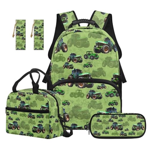 Aplkyhs Tractor Kid Backpack with Lunch Box Boys 5-6/7-8 Green School Bag and Lunch Bag Pencil Case Bookmarks Set 5 in 1 Elementary/Middle School Bookbag Cooler Bags for Kids Girls