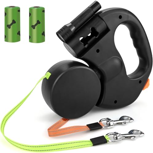 Double Retractable Dog Lead - Double Dog Lead, Reinforced with Non-Slip Handle Dogd Lead, 360° Tangle-Free Strong Nylon Band with Flashlight & Rubbish Box & Garbage Bags for Walking 2 Dogs (Black)