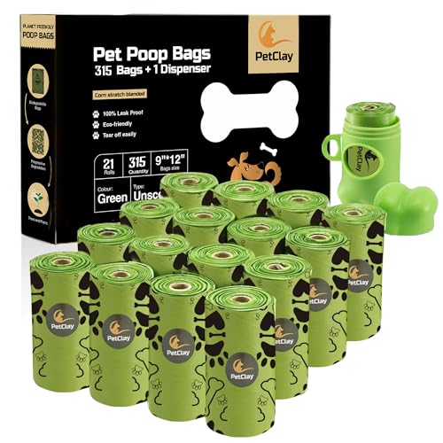 Petclay Dog Poop Bags rolls, 315 Counts Compostable & Biodegradable Dog Poo Bags for Puppy walk 100% Leak Proof for travel | Corn Starch Blended | Extra Thick Refill Large Pet Poo bags for Dogs waste