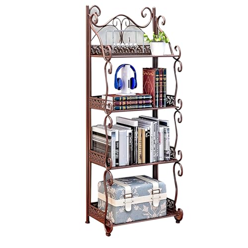 LMXRYPD Multi-Tier Metal Storage Rack, Foldable Metal Cup and Dish Organizer Wrought Iron Bakers Rack, for Kitchen, Bathroom, Office, Study(Brown,4-Tier)