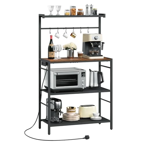HOOBRO Kitchen Storage Rack with Power Outlet, Bakers Rack, Coffee Station with 4 S-Hooks, Microwave Stand with Storage Shelves, Easy to Assemble, Rustic Brown and Black EBF05KHB01