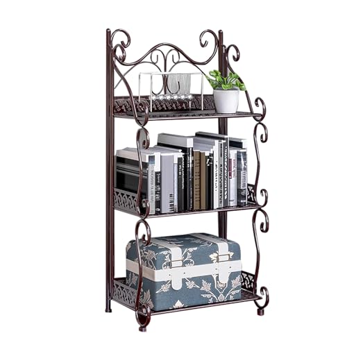 LMXRYPD Multi-Tier Metal Storage Rack, Foldable Metal Cup and Dish Organizer Wrought Iron Bakers Rack, for Kitchen, Bathroom, Office, Study(Brown,3-Tier)