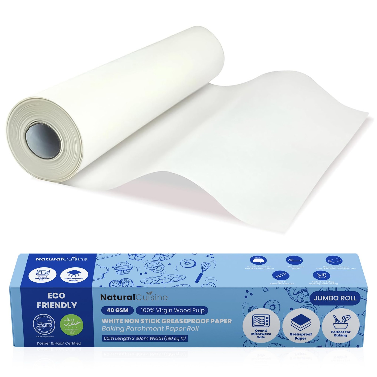 Baking Parchment Paper Roll 30cm x 60m – Silicone-Coated, Double-Sided Non-Stick & Greaseproof – 40gsm Virgin Pulp – Oven & Microwave Safe – BPA Free Halal & Kosher – Cutter Box