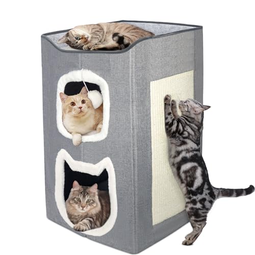 HIOVEL 2 Layer Cat House Beds for Indoor Cats with Scratch Pad and Fluffy Ball, Large Semi-Enclosed Cat Bed Igloo for Multi-Pet Kitten and Little Dogs, Grey