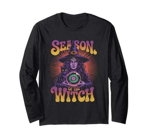 Witch with Crystal Ball and Cat Radiating Cosmic Power Long Sleeve T-Shirt