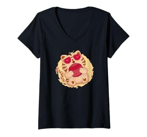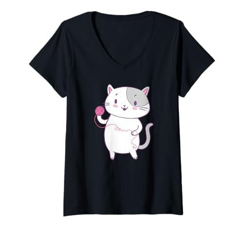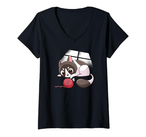 Womens Cat with Yarn Ball - Funny Cat V-Neck T-Shirt