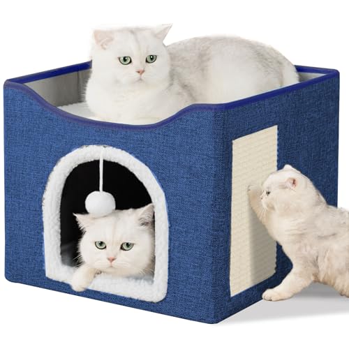 FURRYPAWS Foldable Cat House Cave Bed with Scratching Board & Fluffy Ball, Indoor Cat Igloo Bed for Multi Small Pets, 41x41x34cm, Blue Pet-Safe, Durable, and Easy to Assemble