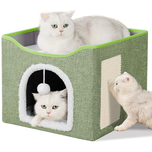 FURRYPAWS Foldable Cat House Cave Bed with Scratching Board & Fluffy Ball, Indoor Cat Igloo Bed for Multi Small Pets, 41x41x34cm, Green– Pet-Safe, Durable, and Easy to Assemble