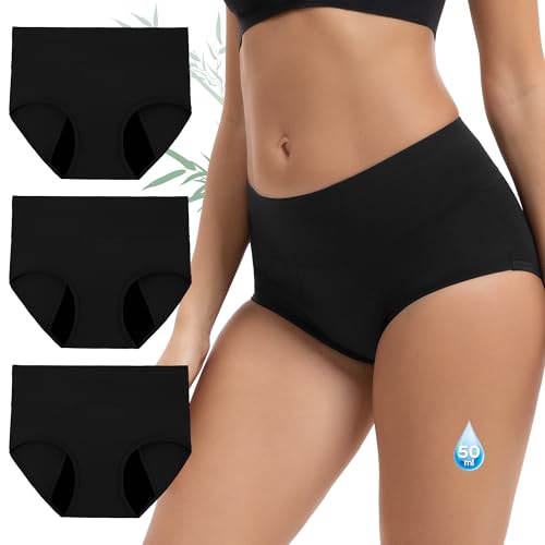 INNERSY Period Pants Heavy Flow Black Bamboo Menstrual Underwear High Rise Leakproof Knickers 3 Pack(18, Black)