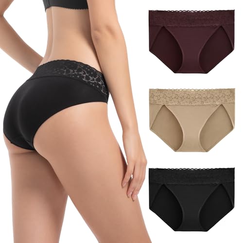 OEIOEI Bamboo Knickers for Women Lace Underwear Ladies Briefs High Leg Microfibre Panties Pack of 3 (M, Black/Burgundy/Khaki)