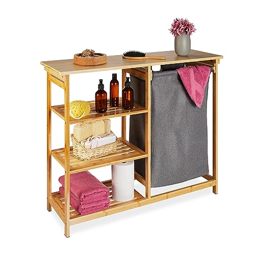 Relaxdays Bamboo Laundry Basket Shelf, 3 Levels, Removable Fabric Bag, HxWxD: 80x100x32cm, Bathroom Bin, Natural/Grey