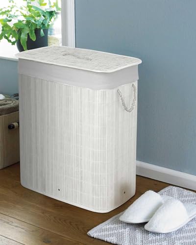 COUNTRY CLUB Oblong Eco-friendly Bamboo Laundry basket with a Lid, Washable Liner and Divider, White, 52 x 32 x 60cm