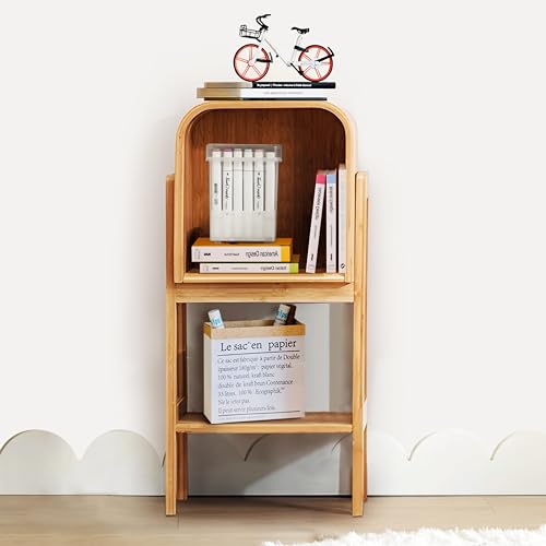 Bamboo Stackable DIY Bookshelf, Book Storage Cabinets Stand Modern Rack Bamboo Shelf Nightstands Set with Open Storage Compartment, Creative Rounded Edges Bedside Table for Bedroom Living Room, 3-Tier