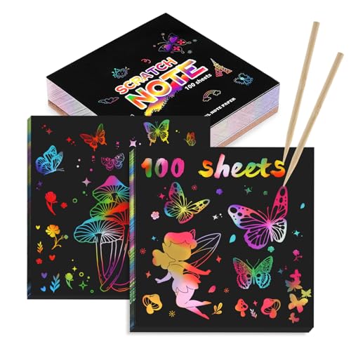 Scratch Paper 100 Sheets Magic Scratch Art Set Scratch Paper Boards Scratch Off with 2 Bamboo Stylus for Kids DIY Art& Craft Drawing Note Taking