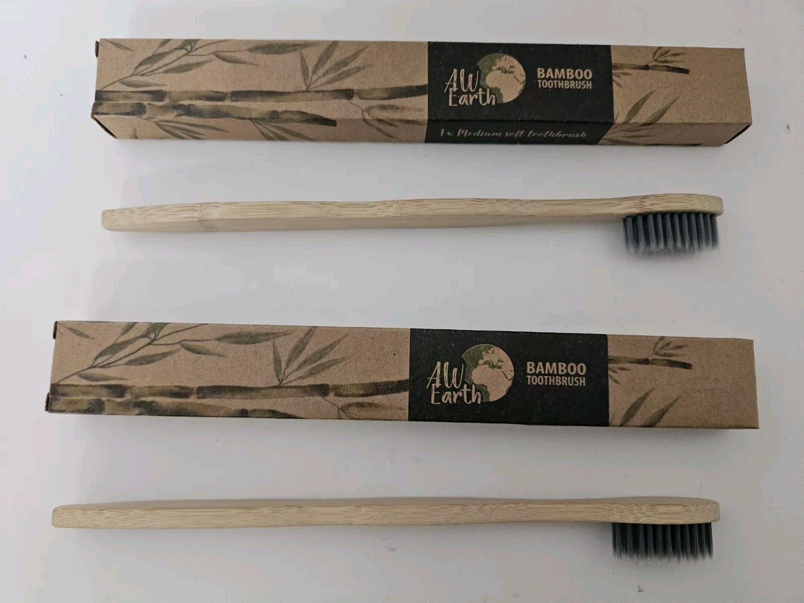 2 Bamboo Toothbrushes Medium Soft Charcoal Eco Friendly Sustainable Vegan Boxed