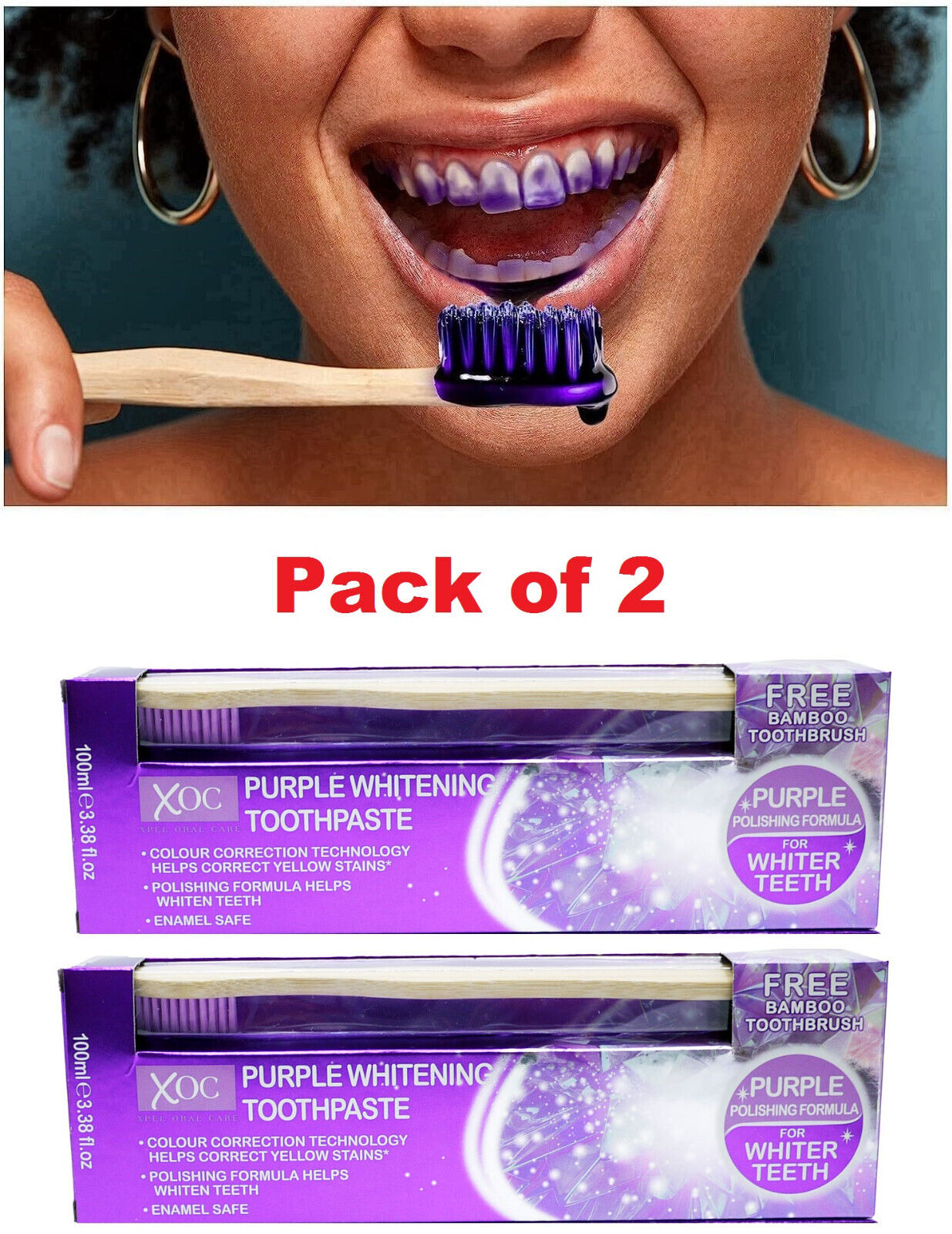 Pack of 2 Xpel Oral Care Purple Whitening Toothpaste 100ml + Bamboo Toothbrushes