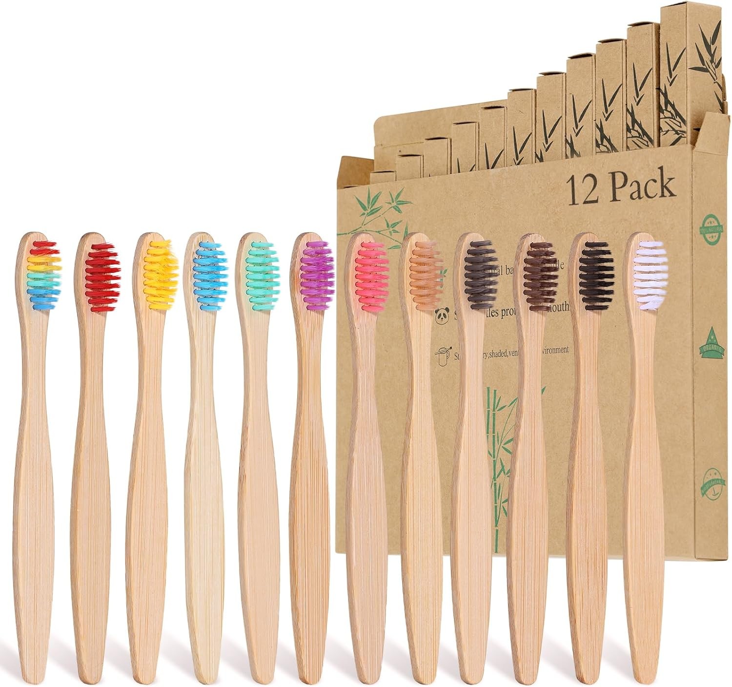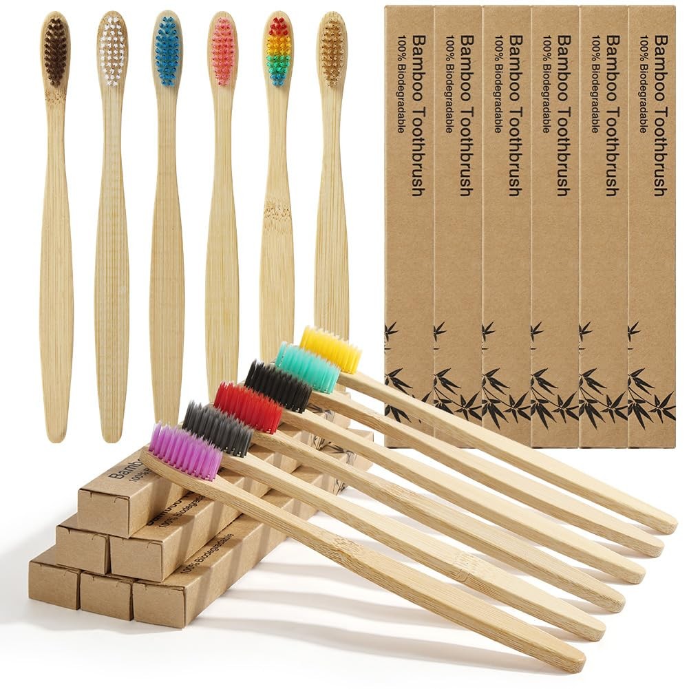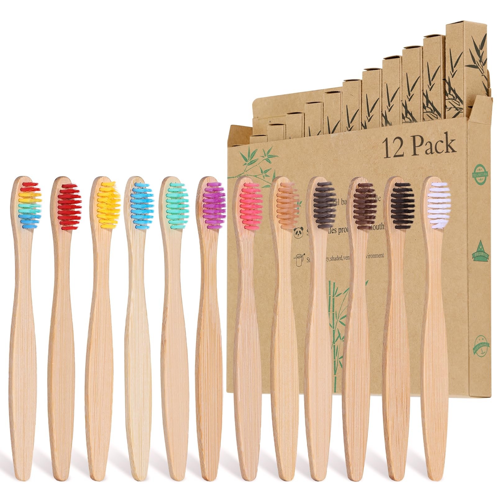 Bamboo Toothbrushes for Adults, 12 Pack Eco Friendly Natural Wooden Toothbrush,