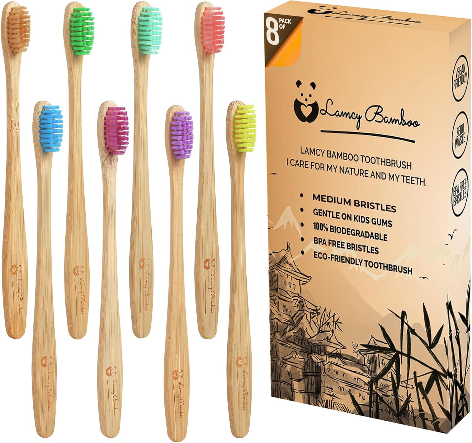 Lamcy Bamboo Toothbrushes for Adults with Medium Bristles | Pack of 8 Natural B