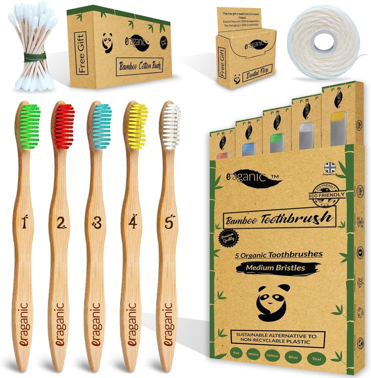 Eraganic Bamboo Toothbrushes - Pack of 5 with Bamboo Cotton Buds & Dental Floss