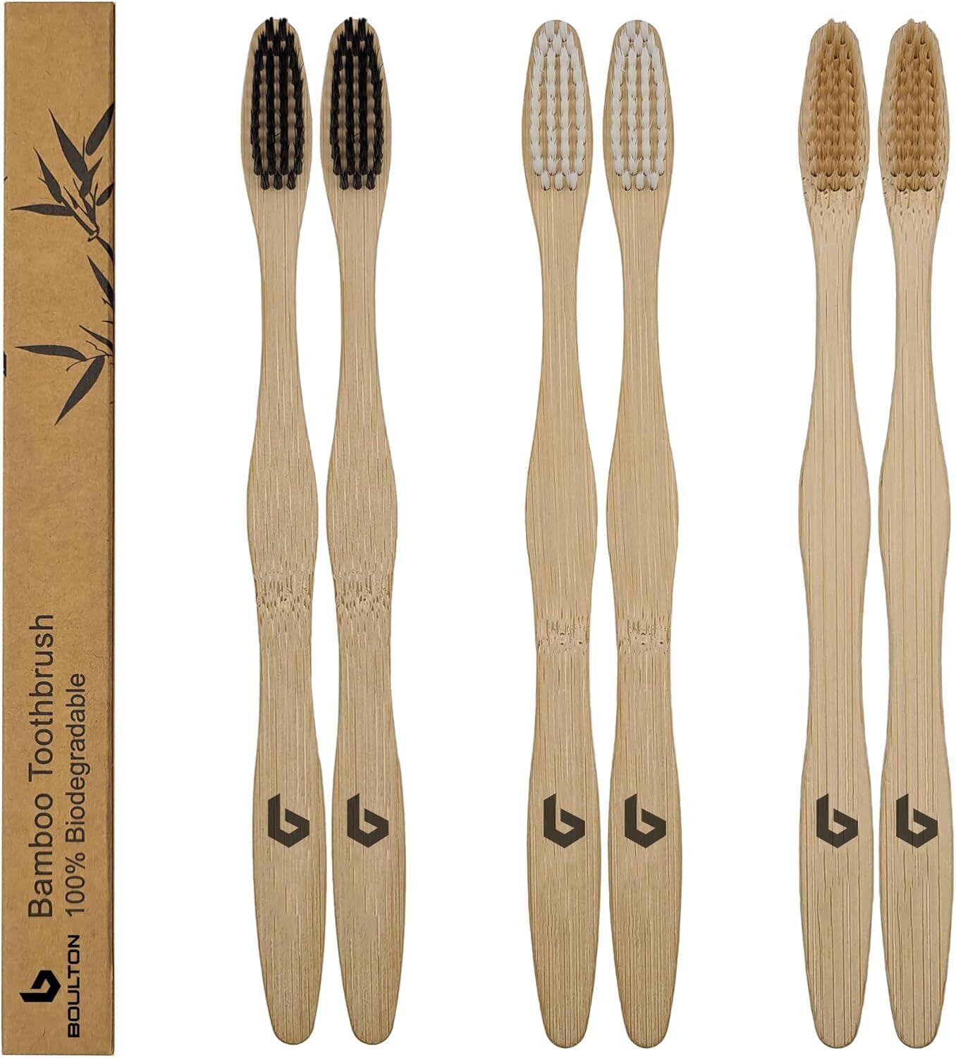 BOULTON Bamboo Toothbrushes – Pack of 6 | Eco Friendly Natural Wooden Toothbr