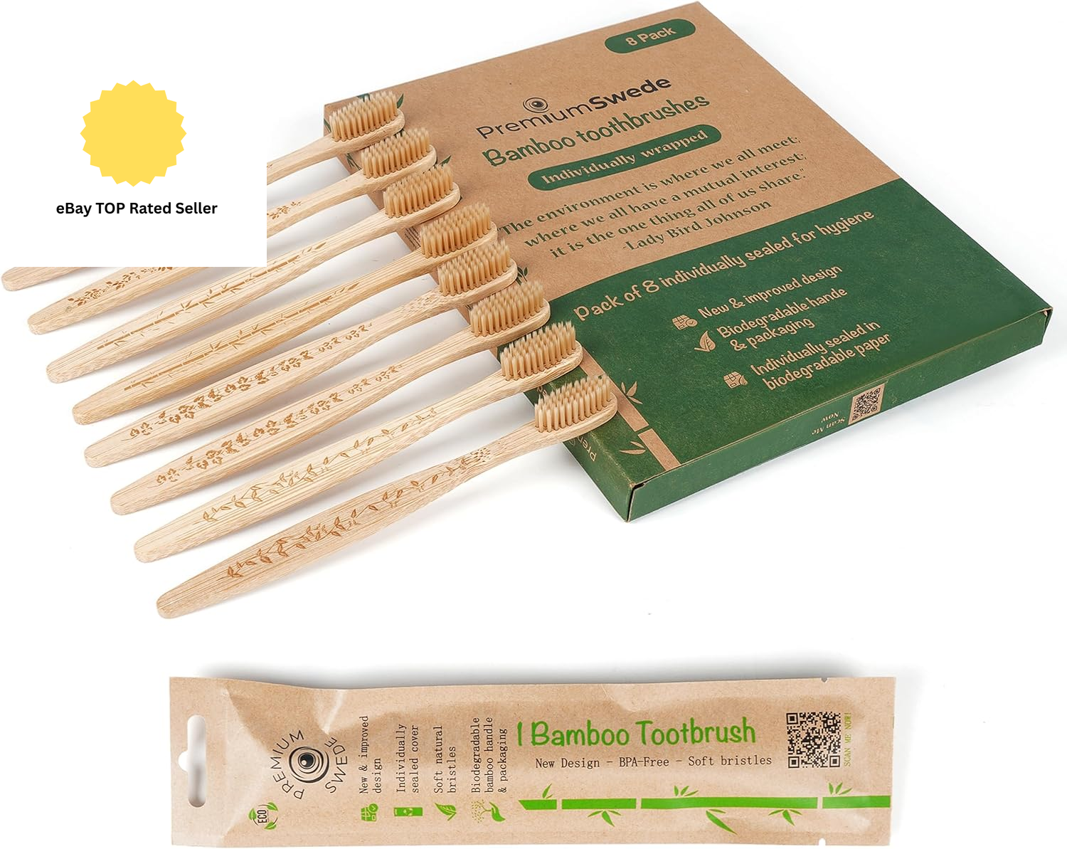 Bamboo Toothbrushes Toothbrushes Individually Wrapped 8 Pack - Eco-Friendly Sof