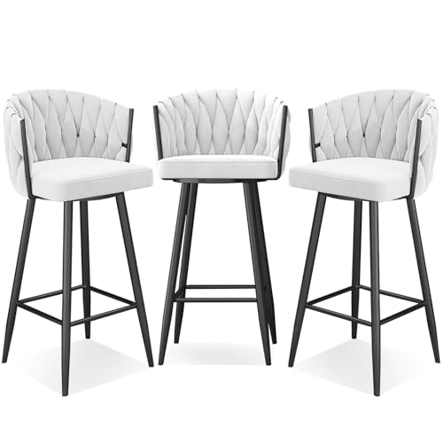 WWERTYY Modern 360° Swivel Barstools, Bar Height Bar Stools Set of 1/2/3/4, 25.6/29.5 Inch Seat Height Upholstered Kitchen Chairs with Steel Legs and Footrest,White Black Leg,3 PCS