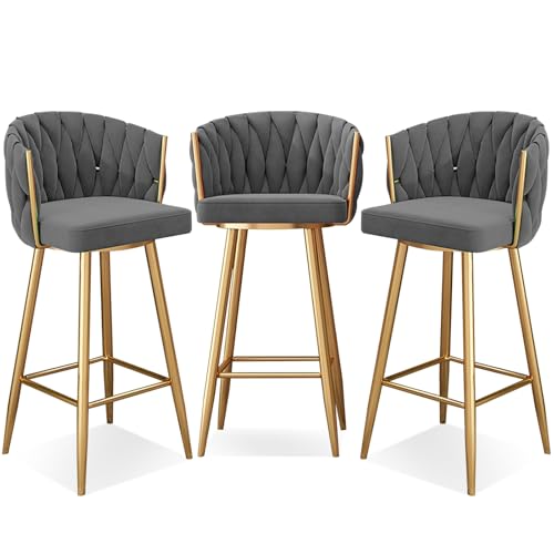 Velvet Bar Stools Set of 1/2/3/4, Counter Height Barstools with Woven Backrest, 360° Swivel Stool, Kitchen Bar Chair with Golden Footrest for b, Kitchen,Café, Dining Room, Grey (Gold Legs 3p