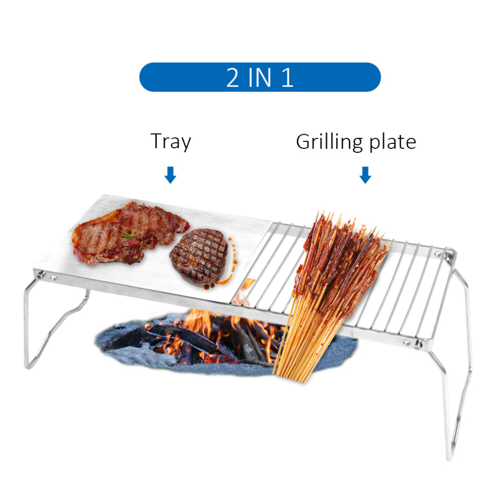 2 in 1 Outdoor Folding Stove Stand & Barbecue Grill Camping Table Pot Holder BBQ Net Stainless Steel Firewood Bracket Picnic Tool For Hikin