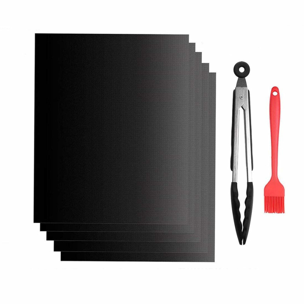 GOFRIEND BBQ Grill Mat Set of 5, Non-stick Barbecue Grill & Baking Mats for Baking on Gas, Charcoal, Oven and Electric Grills - Reusable - Free 12" BBQ Tongs and Silicone Brush