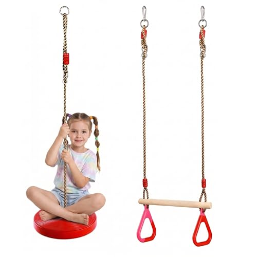 The Magic Toy Shop Trapeze Bar & Round Button Swing Seat Set with Adjustable Ropes - 2-in-1 Weather Resistant Garden Climbing Frame Accessories & Red Outdoor Play Equipment for Kids, Ages 3+