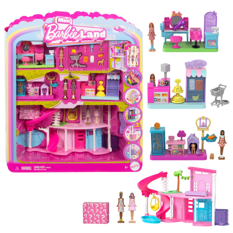 Barbie Mini Barbie Land DreamHouse & 3 Playsets with 4 1.5-Inch Dolls, Doll House Furniture & Accessories, Includes Pet Boutique, Hair Salon, & Super