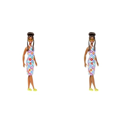 Barbie Fashionistas Doll #210 with Brown Hair in Bun, Wearing Colorful Crochet Halter Dress, Sunglasses and Sandals, HJT07 (Pack of 2)