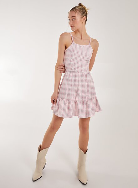 Pink Vanilla Open Back Gingham Skater Dress