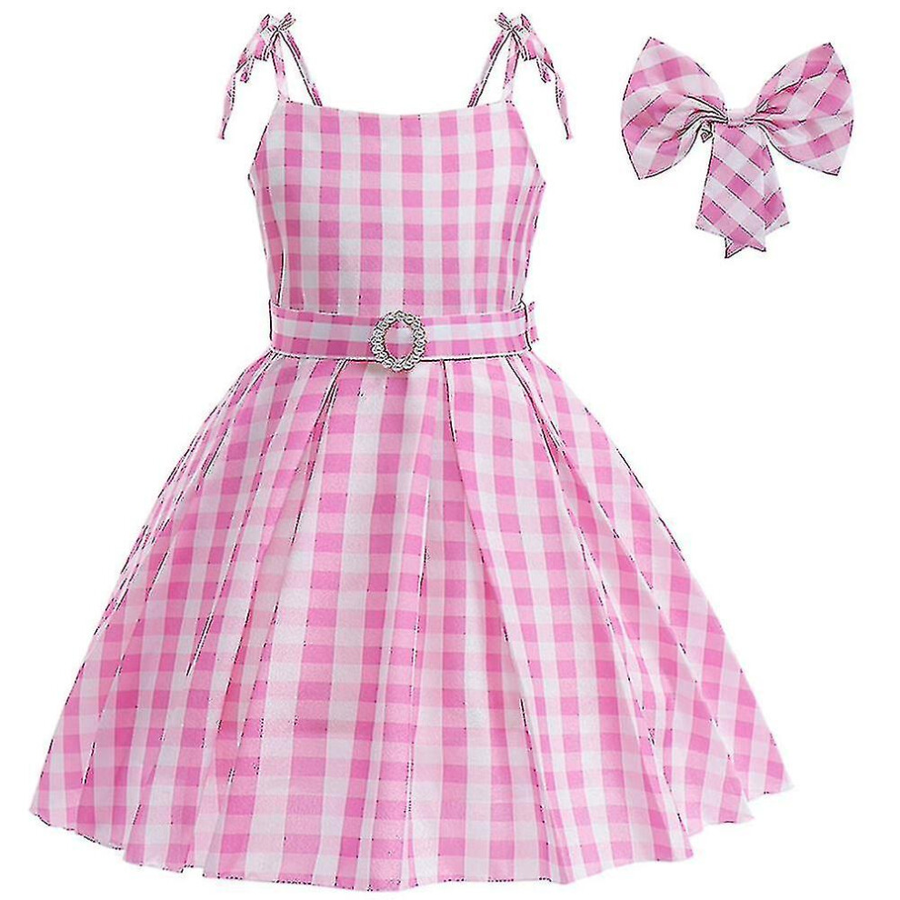 (6-7 Years) Barbie Cosplay Costume Dress Girls Margot Robbie Movie Outfit Kids Pink White Gingham Fancy Dress Party Dress Up With Bow Hair Clip