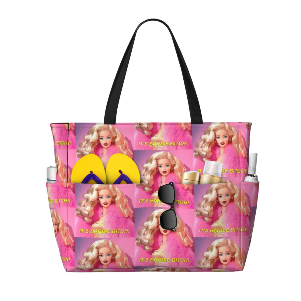 (It's Barbie Bitch!_3785) Beach Bag for Women Large Capacity Waterproof Sandproof Tote with 7 Pockets Pool Zipper Bags for Travel Vacation Gym Camping