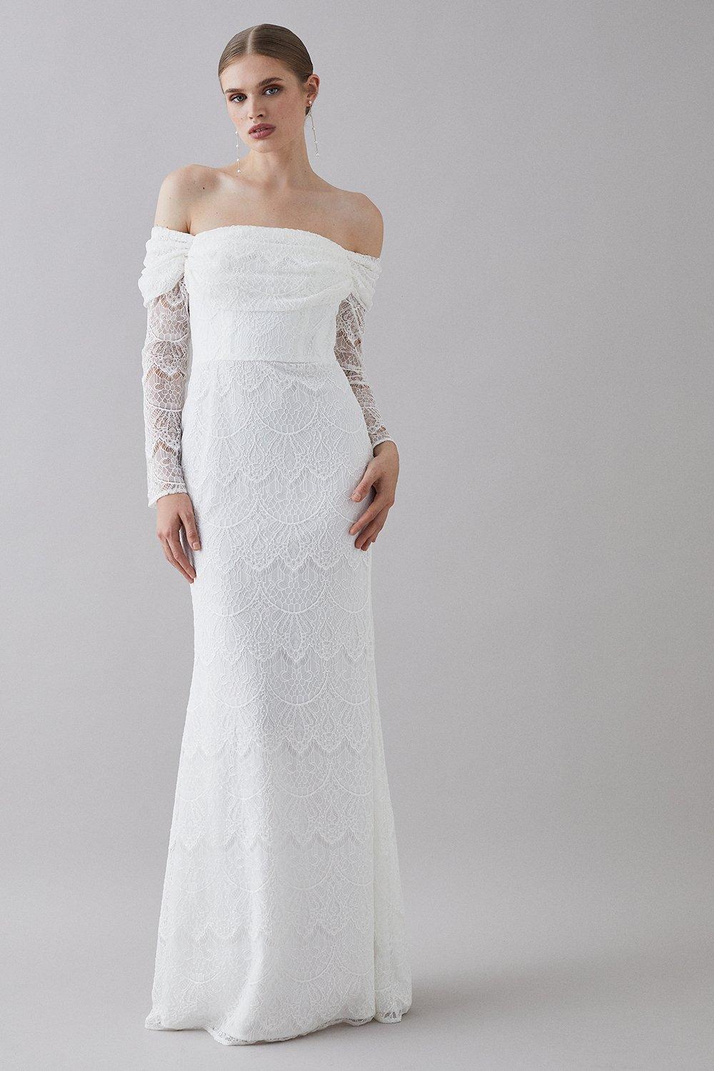 Eyelash Lace Bardot Long Sleeve Dress