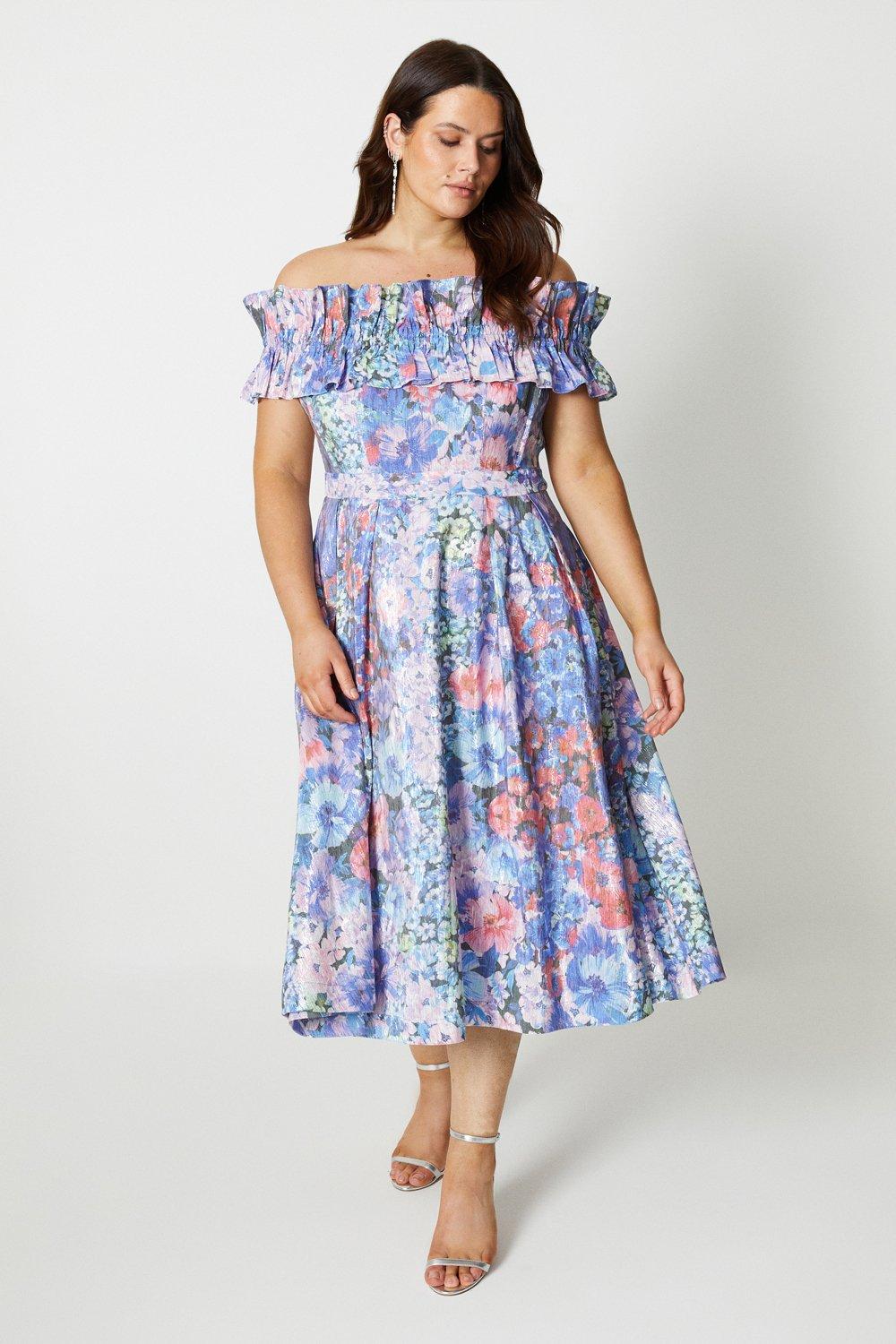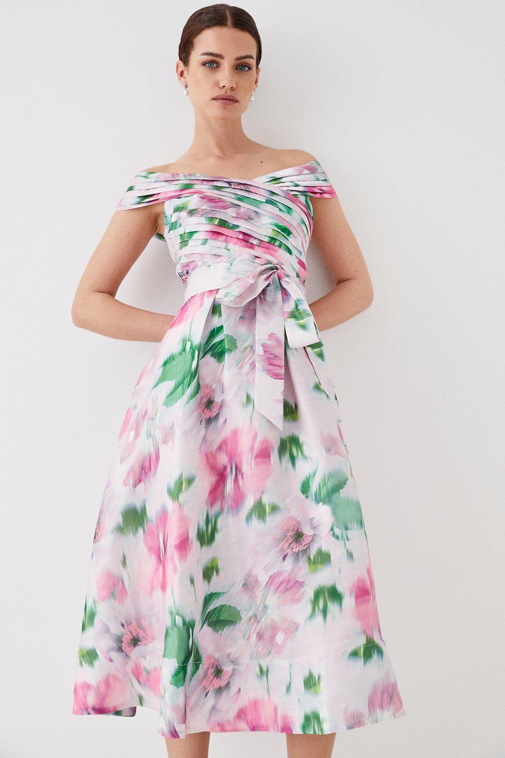 Goddiva Floral Bardot Pleated Midi Dress
