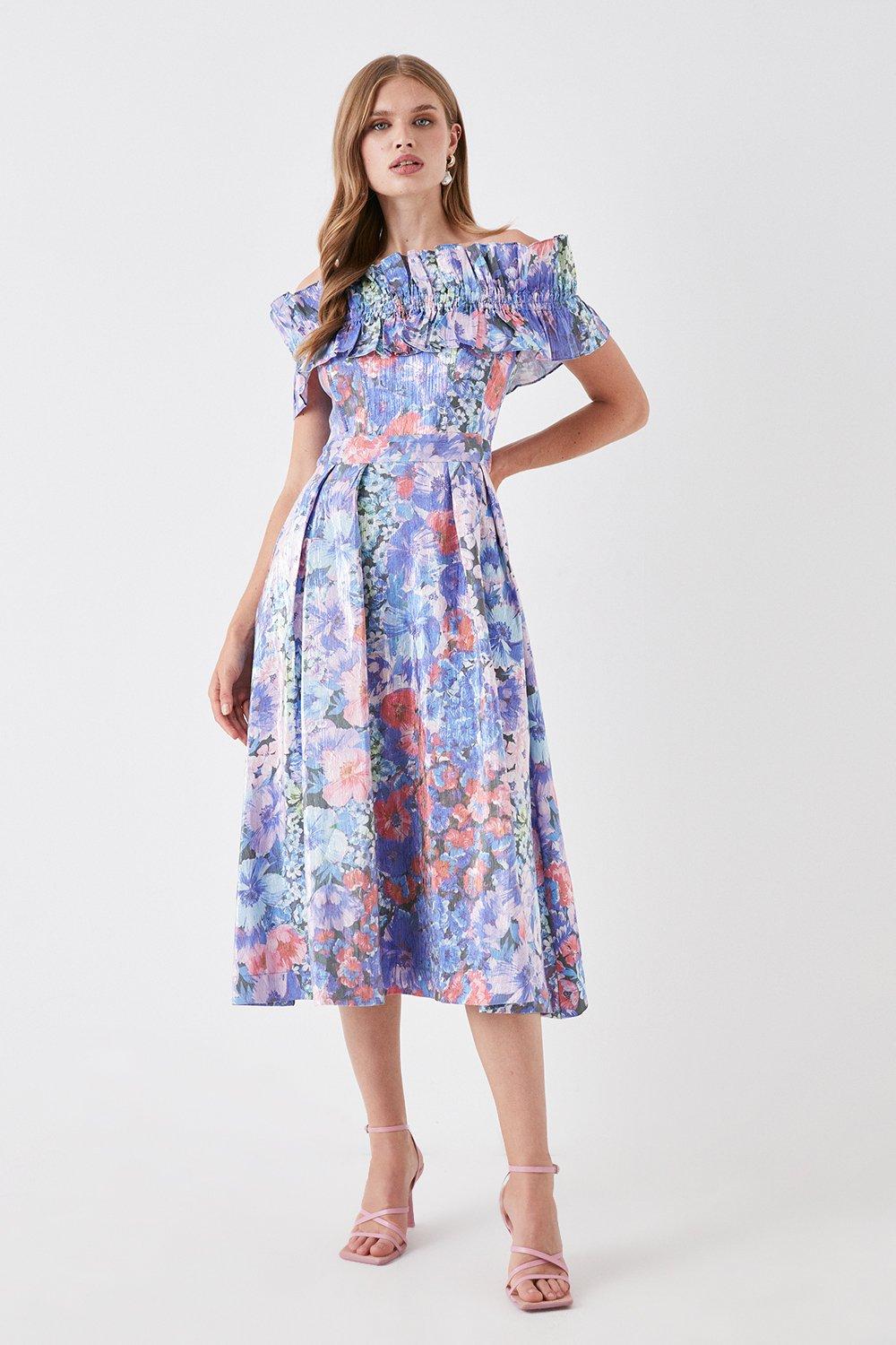Flower Ruffle Bardot Midi Dress