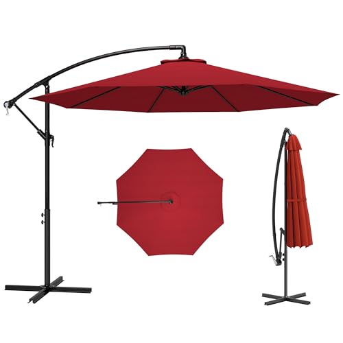 Outsunny 3(m) Garden Banana Parasol Hanging Cantilever Umbrella with Crank Handle, 8 Ribs and Cross Base for Outdoor, Sun Shade, Wine Red