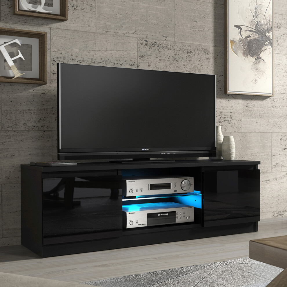 TV Stand 120cm Matt Black Body Gloss Black Doors With LED Compact Modern Unit VELERA